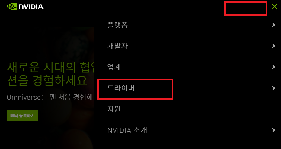 오른쪽 상단 메뉴 버튼을 누르면 드라이버 메뉴를 확인할 수가 있습니다. 모든 NIVIDIA 드라이버로 진입해줍니다.