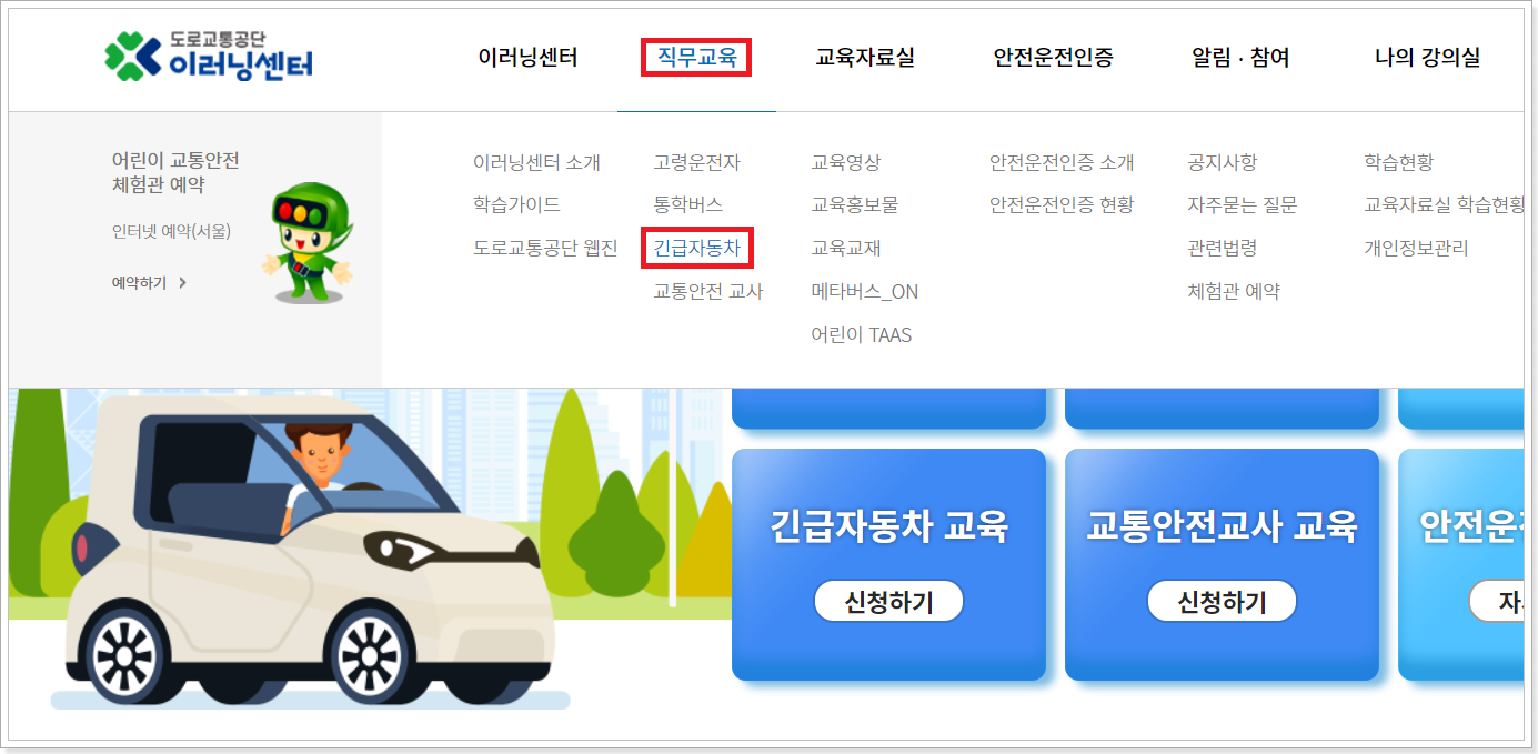 2. 직무교육메뉴 > 긴급자동차 메뉴를 클릭합니다.