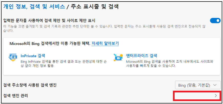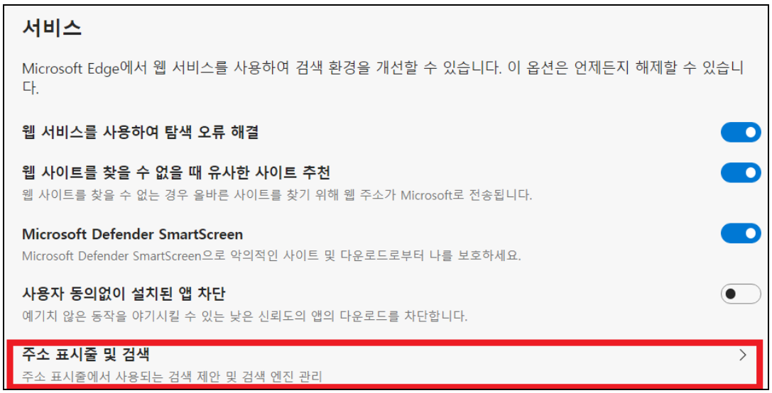 왼쪽 메뉴의 "설정" 트리 중에서 "개인정보, 검색 및 서비스" 를 눌러 진입해 줍니다. 그리고 가장 아래로 스크롤을 내려 주시면 "주소 표시줄 및 검색" 옵션을 찾을 수 있습니다.