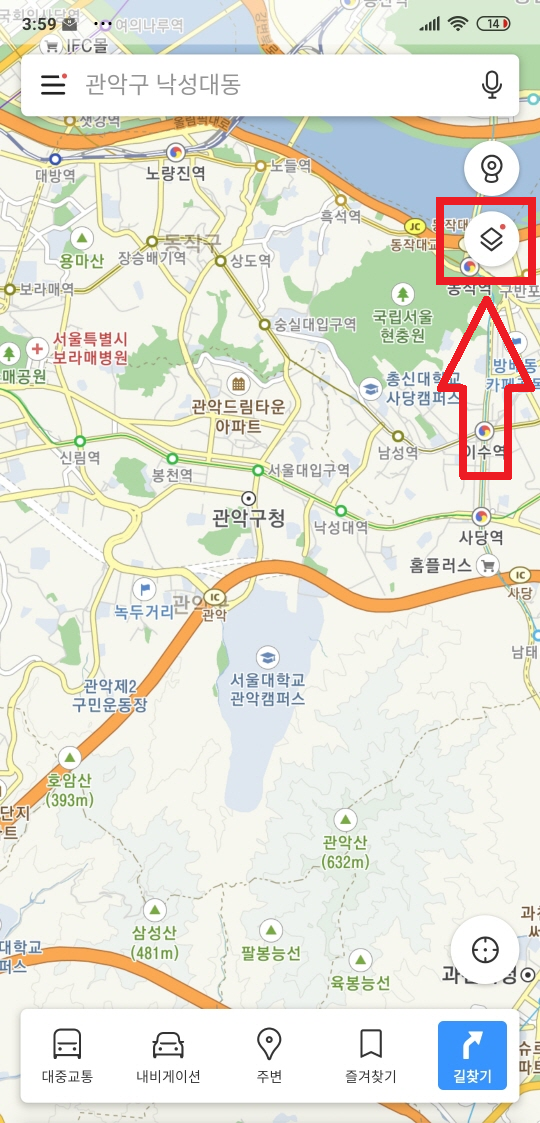카카오맵을 설치 한 다음 오른쪽 위에 종이 두 장을 포개 놓은 것같은 그림을 눌러 줍니다. 참고로 그 위에 버튼은 스트릿뷰를 볼 수 있는 버튼입니다.