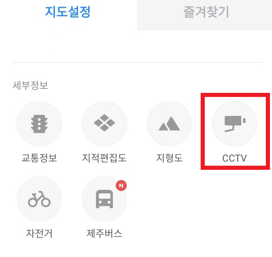 지도설정에 진입하였습니다. 메뉴 중 CCTV가 보입니다. CCTV 뿐만아니라 교통정보, 지적편집도, 자전거, 제주버스, 지형도 등을 서비스 하고 있습니다. 유용한 기능이 굉장히 많습니다.