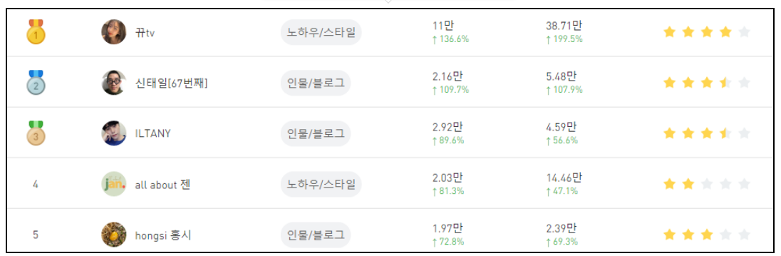 예를 들어 구독자 급상승 순위를 보면 단기간 내 순위가 오른 채널을 볼 수가 있습니다. 반대로 만약 구독자 구독취소 순위를 보면 급격히 구독자가 줄어드는 채널을 볼 수가 있겠지요. 아마도 어떤 다양한 이슈가 있는 채널들이 있는 것 같습니다.