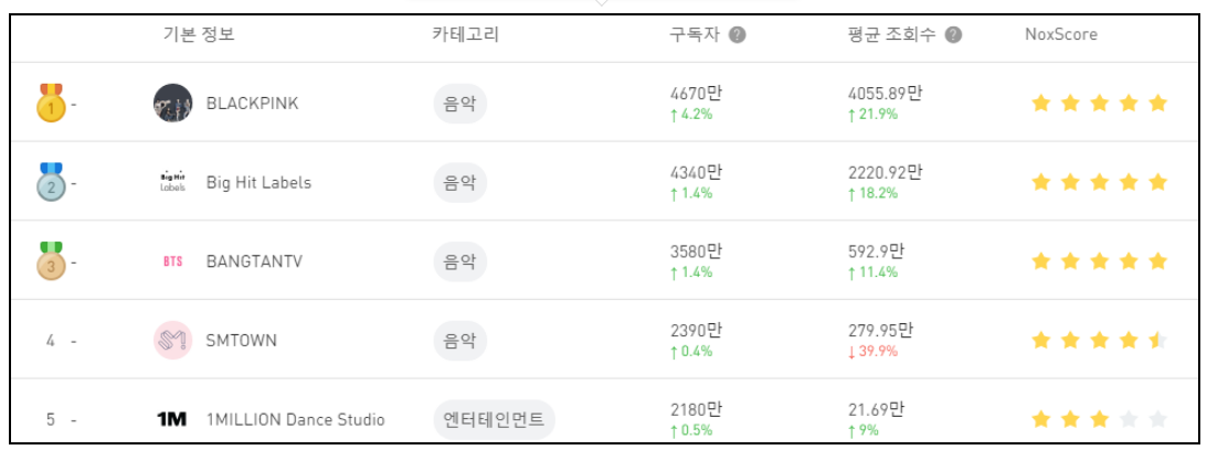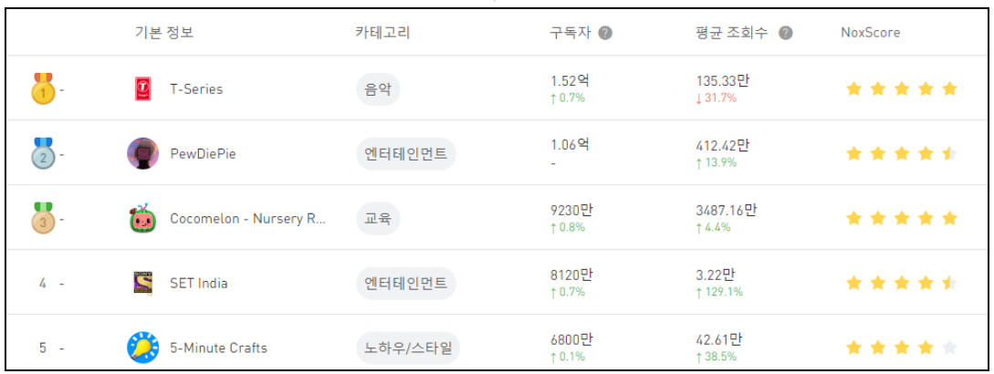 구독자 순위뿐만 아니라 "Nox 평점 순위", "평균 조회수 순위", "구독자 급상승 순위", "구독자 구독취소 순위", "30일 누적 조회수 순위" 등을 기준으로 놓고 볼 수도 있습니다.