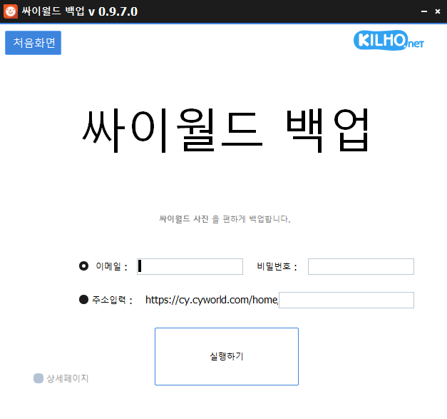 싸이월드 백업 v0.9.7.0 버전의 프로그램을 확인할 수가 있습니다. 이메일과 비밀번호를 입력해주세요. 만약 아이디 비밀번호를 끝내 찾지 못했다면, 본인의 싸이월드 주소를 입력해주세요. 그리고 실행버튼을 눌러줍니다.