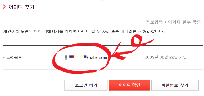 그래서 저는 내가 가입했던 정보로 찾기를 통해 아이디를 찾았습니다. 2009년에 가입을 했었네요. 아마 재가입했었던 것 같습니다. 이전에 했었던 기억도 있는데요....