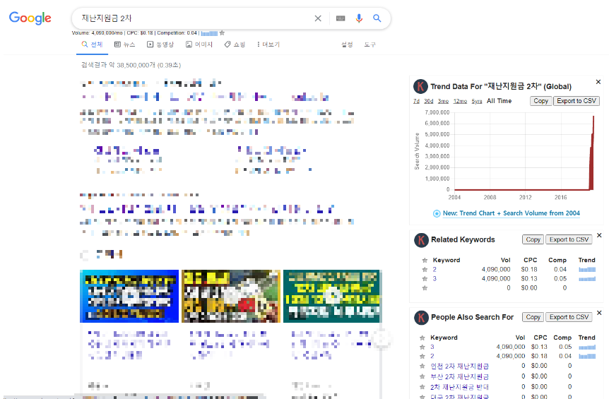 재난지원금2차에 대한 cpc는 0.18이고요. Related Keywords는 뜨지 않네요. 이건 꺼주시면 좋습니다 경쟁률은 0.04로 굉장히 낮습니다. 검색은 4백만건이고요.