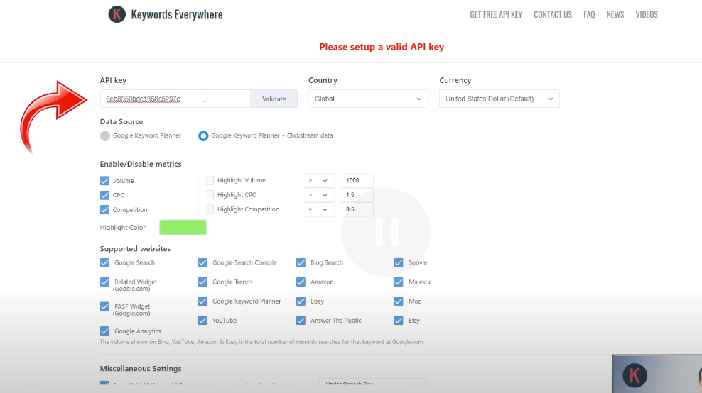 아래 화면처럼 API 키를 입력해줍니다. API key is valid가 뜨면 정상적으로 등록된것입니다.