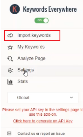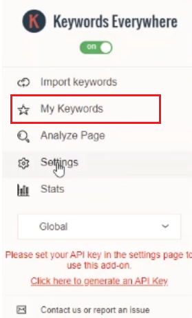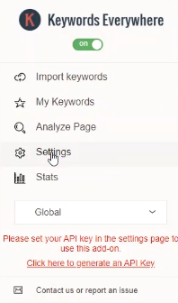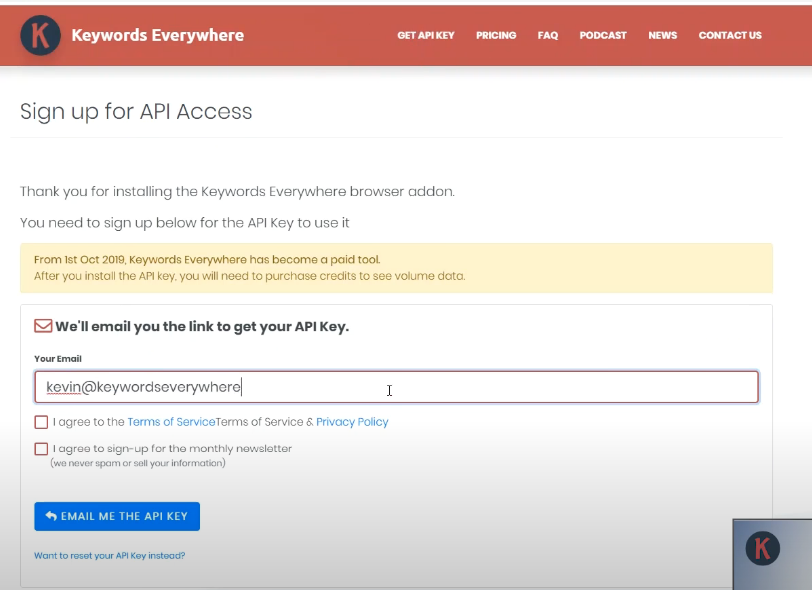 Keywords Everywhere 홈페이지 상단위 Get API key를 눌러 이메일을 적어 주고 API키를 발급받습니다. 10~15분 정도 걸립니다. 안오면 스팸메일함도 확인해보세요. 이메일은 구글메일로 해주세요 네이버메일은 안됩니다.