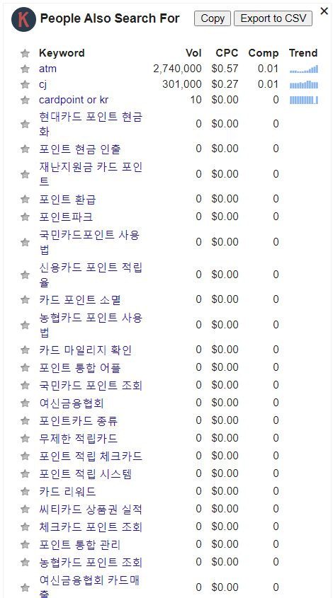 Volume : 8.100mo CPC : $3.91 경쟁도 0.31이라고 나옵니다. 오른쪽에는 관련 키워드툴과 PASF 툴이 같이 검색이 되는데 여기서 보는 키워드 1개당 1개의 Credit을 사용하기 때문에 Credit을 아끼기 위해서는 오른쪽에 뜨는 Related Keywords 와 PASF 툴의 위젯을 꺼줘야합니다.(필요시)