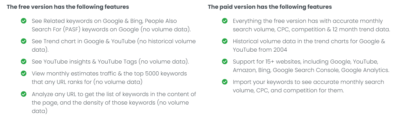 - 무료버전에서 지원하는 모든 것 + 정확한 1개월별 검색량, CPC, 키워드 경쟁도와 12개월 트랜드데이터