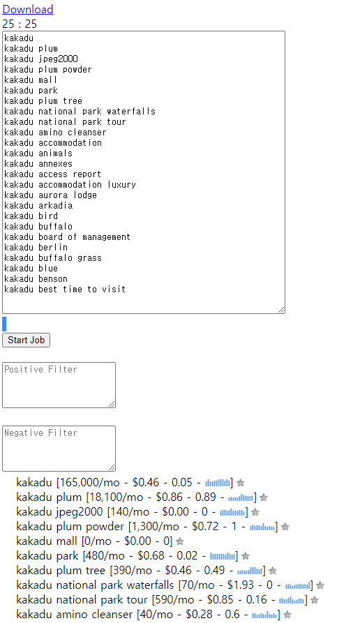 키워드 쉬터에 들어가서 검색을 해도 아래에 키워드 마다CPC 등 정보를 확인할 수가 있습니다. 하지만 역시나 키워드 하나당 하나의 크레딧이 소모 됩니다. 😁카카두 국립공원 폭포가 CPC가 높은 것을 확인할 수가 있습니다.