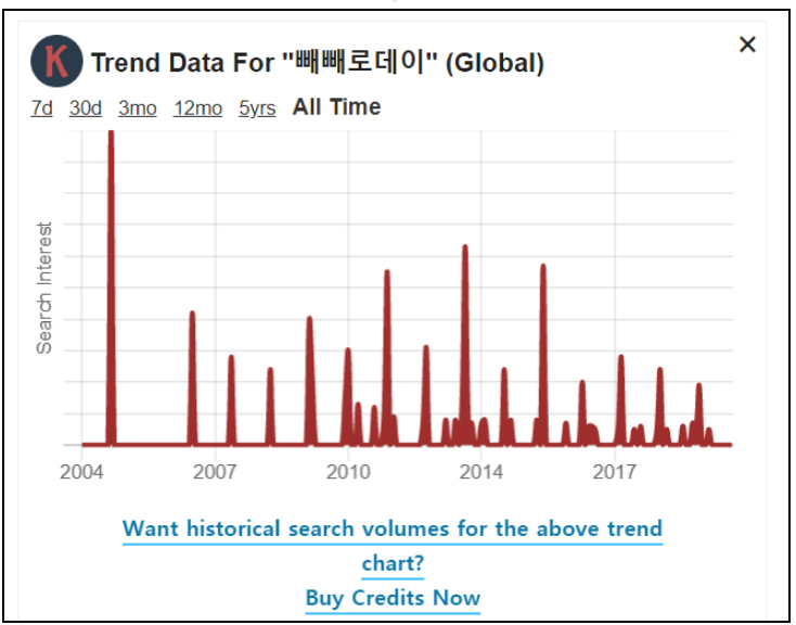 2004년부터 서비스를 시작했기 때문에 2004년 부터의 데이터를 볼 수가 있습니다. 빼빼로 데이는 11월만 되면 난리가 나죠? Google Trend라는 서비스에서 비공식적으로 제공하는 API를 끌어다가 이렇게 표시를 해주는 것입니다. 여기서 1차적으로 키워드에대한 동향을 확인할 수가 있습니다. 모든 키워드가 이렇게 트랜드에 표시되지는 않습니다.