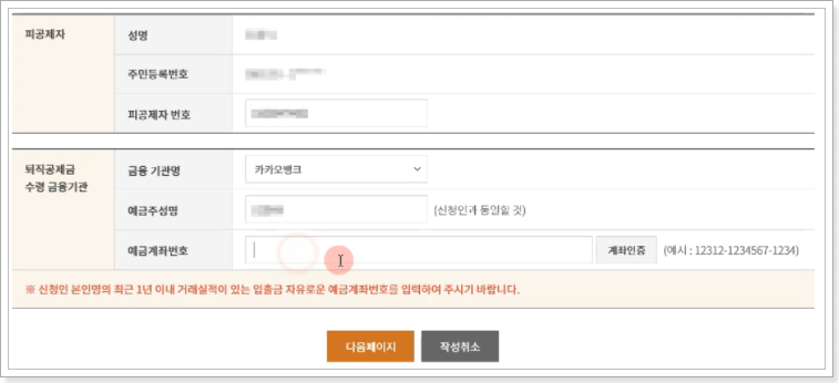 ※ 신청을 완료한 뒤 심사를 통해 퇴직금이 등록한 계좌번호로 입금되며 일반적으로 14일 이내로 처리됩니다.