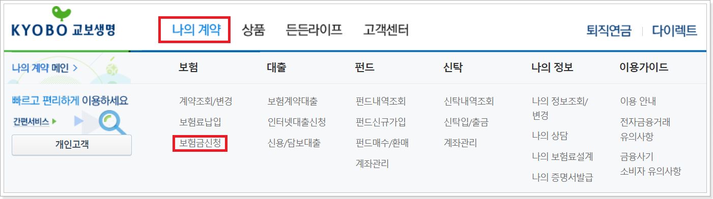 2. 나의계약 메뉴에서 '보험금 신청'을 클릭합니다.