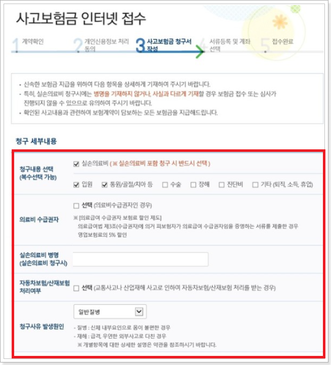 5. 청구할 보험금의 세부내용을 기입합니다.[각주:1]