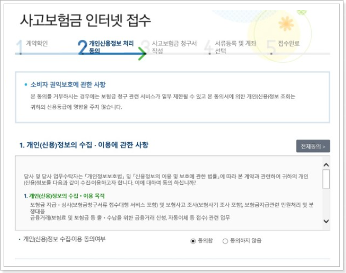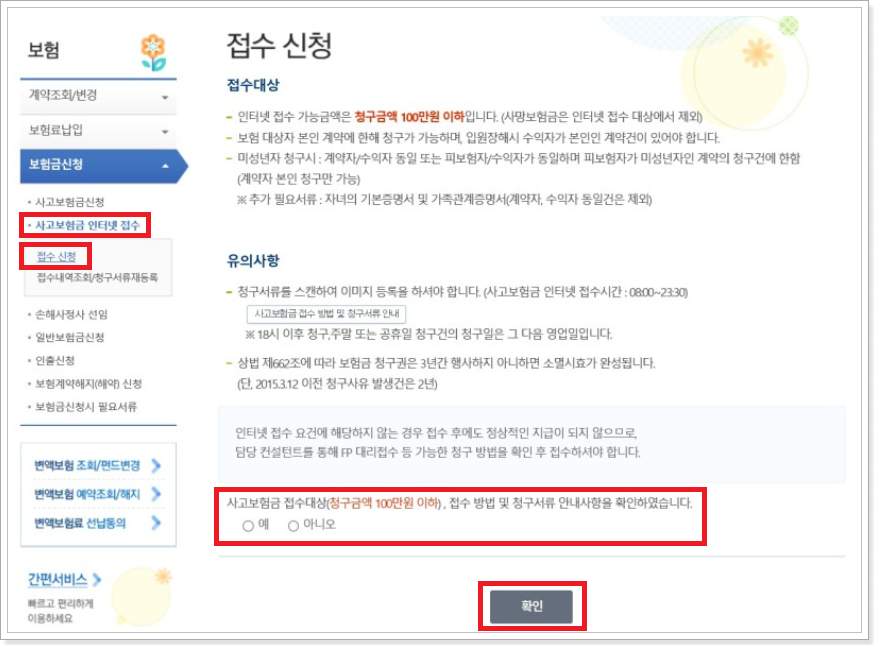 3. 사고보험금 인터넷 접수메뉴에서 접수 신청을 합니다.