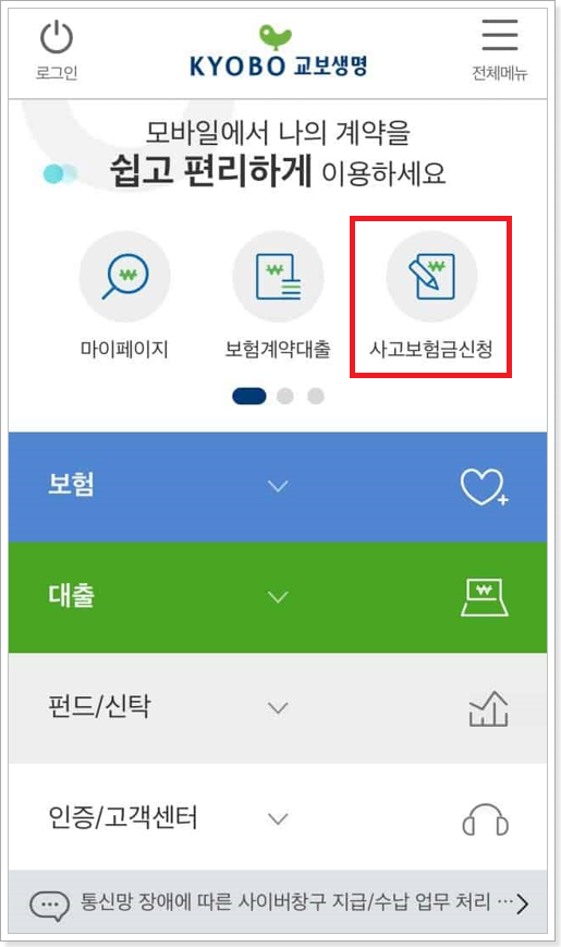 1. 실비보험 온라인청구 방법은 교보생명 홈페이지로 접속한 뒤 공인인증서 로그인을 합니다.