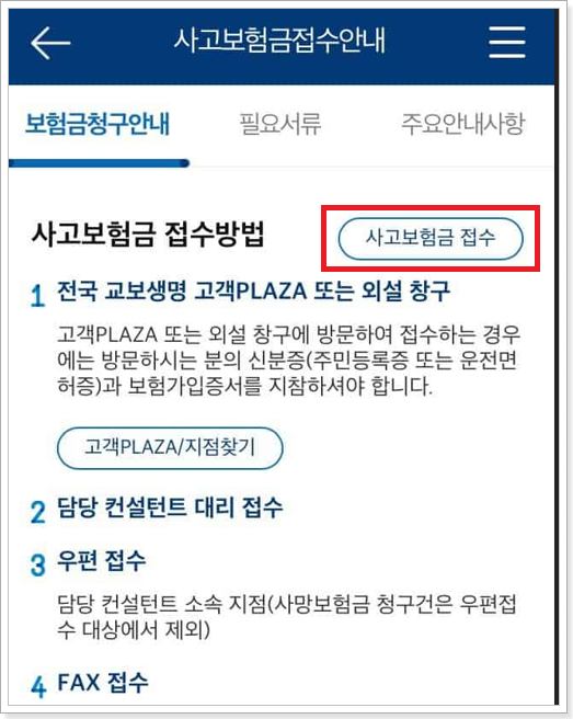 보험 청구 금액이 300만원 이하인 사람은 온라인 혹은 모바일로 청구가 가능합니다. 만약 300만원을 초과한다면 보험사 담당자에게 직접 서류를 우편이나 팩스로 제출하거나 대리접수해야하며 혹은 교보생명 고객플라자에 직접 방문 하여 제출해야합니다.