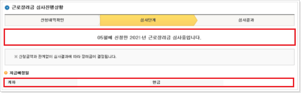 4.  심사진행상황과 근로장려금 지급예정일을 확인합니다.