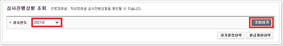 홈택스 조회/발급 → 근로장려금 자녀장려금 → 심사 진행상황 조회 → 정기 심사진행 조회