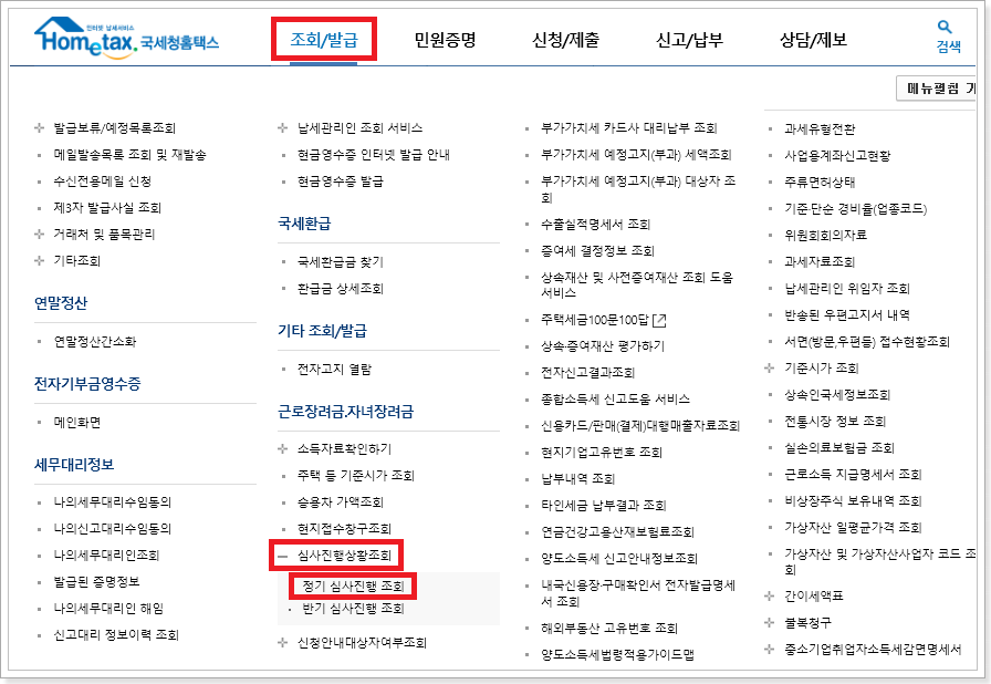 2. 조회/발급 메뉴에서 근로장려금의 심사진행상황조회를 클릭하고 정기 심사진행조회를 선택합니다.