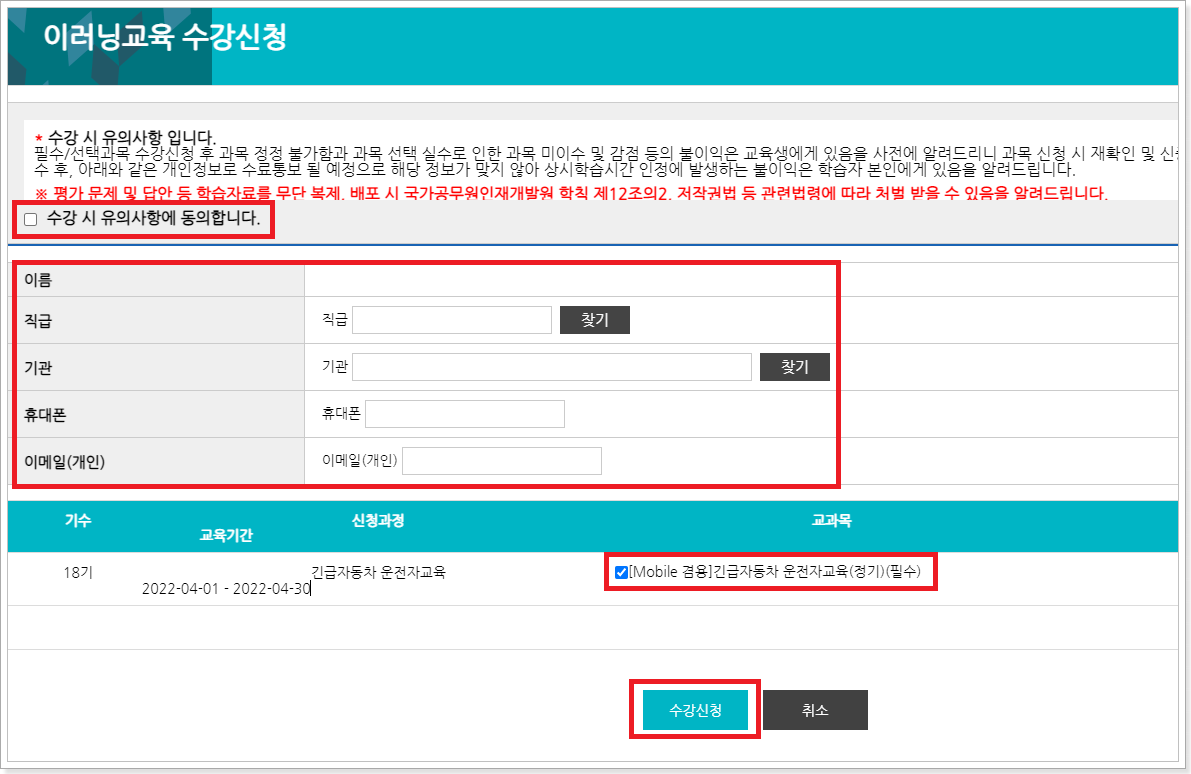 4. 수강시 유의사항 동의, 개인정보 등을 확인하고 수강신청을 클릭합니다.