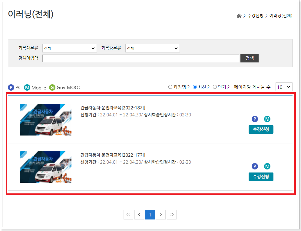3. 이러닝 전체 목록에서 긴급자동차 운전자교육을 선택합니다.