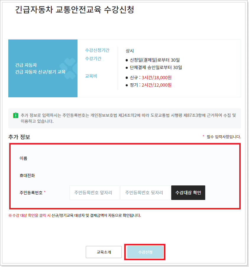 4. 이름, 휴대전화번호 그리고 주민등록번호를 입력하고 수강대상을 확인하고 수강신청을 클릭합니다.
