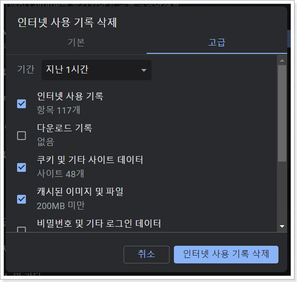 브라우저에서 이런 문제가 발생하는 경우에는 쿠키와 캐시를 먼저 제거해주세요. 크롬을 사용하시는 분들은 Ctrl + Shift + Del 단축키를 이용해 브라우저 쿠키 및 캐시 지우는 옵션창으로 이동해줍니다.