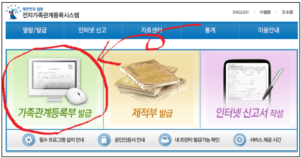 전자가족관계등록시스템(http://efamily.scourt.go.kr/)으로 들어간 뒤 각종 보안프로그램을 설치해줍니다.