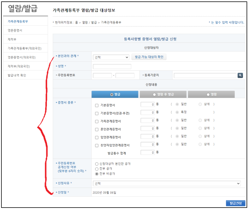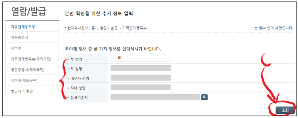 아버지, 어머니, 배우자, 자녀 그리고 등록기준지 중 택1하여 정보를 입력해줍니다.