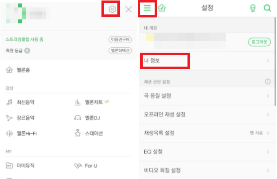 멜론 어플에 우선 들어가 주셔야겠지요. 멜론어플 상단에 메뉴 버튼을 누르고 설정으로 진입해 줍니다. 설정은 항상 톱니바퀴 모양이지요. 그리고설정에 진입해 준 뒤 '내정보'를 눌러서 접속해주세요.