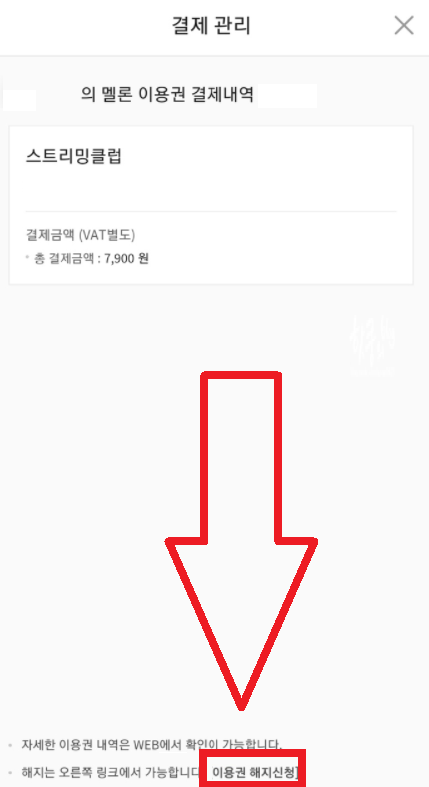 이용권관리>결제방법 변경/관리> 결제관리 > 이용권해지 신청을 차례로 눌러주시면 됩니다. 이용권해지신청은 굉장히 작은 글씨로 되어있고 찾기도 힘들게 되어있네요. 생각보다 이용권해지신청 과장이 복잡하게 되어있습니다. 아마도 해지를 다시한번 생각해달라는 멜론의 무언의 압박같네요.