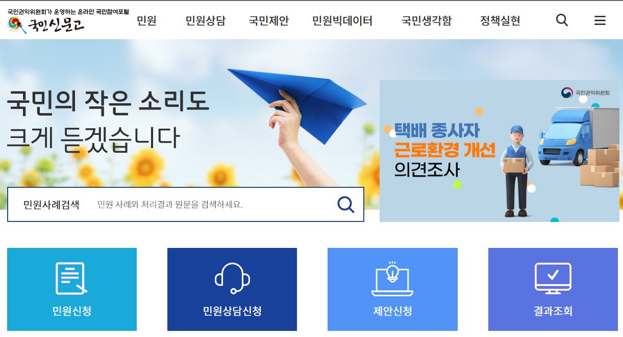인터넷으로도 민원을 넣을 수가 있는데요. 내가 만약 어떤 문제에 직면해서 피해를 입었다면 우리가 먼저 생각해내야할 것이 바로 국민신문고입니다.www.epeople.go.kr/index.jsp 국민신문고 홈페이지에 접속해서 민원을 신청할 수가 있는데요.