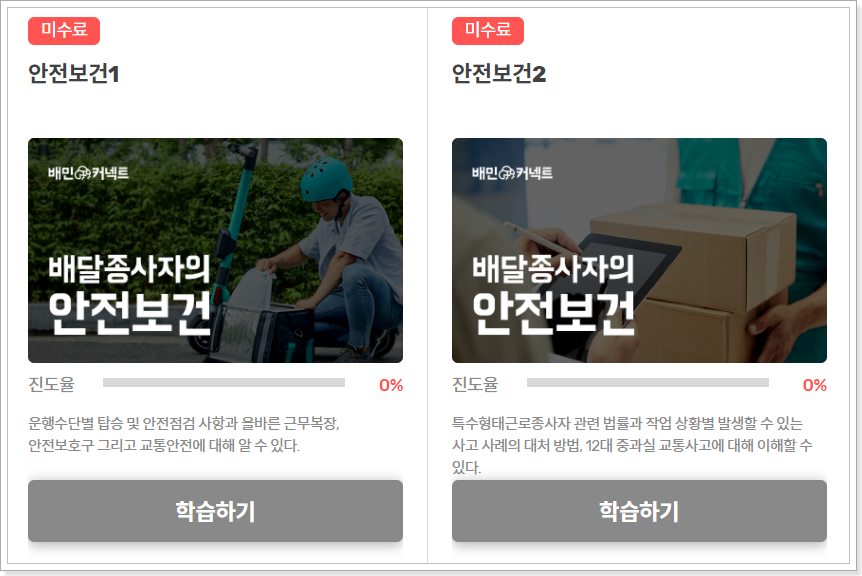 배민커넥트 어플에서 회원가입하는 것과는 별개로 PC에서 안전교육에 가입하여 안전보건교육 2시간을 이수하여야합니다.