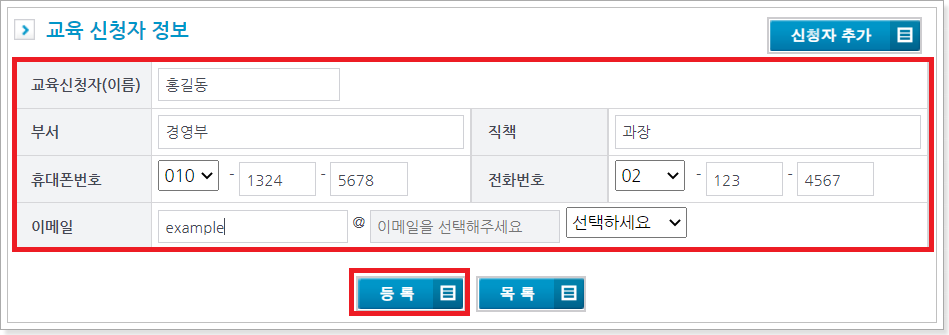 9. 교육 신청자 정보를 입력하고 등록을 클릭합니다.