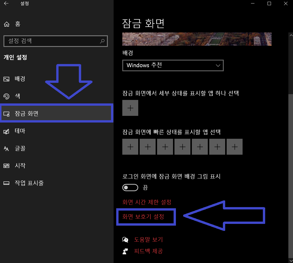 개인설정의 왼쪽 메뉴 트리에서 "잠금화면"을 눌러서 진입해 준 뒤, 화면 보호기 설정으로 진입해 줍니다.