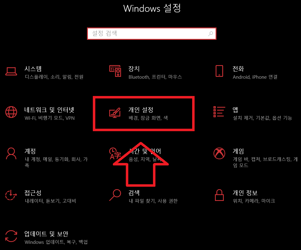 혹은 Win + i 키를 눌러 설정으로 진입해서 개인설정 메뉴로 들어가도 똑같습니다.