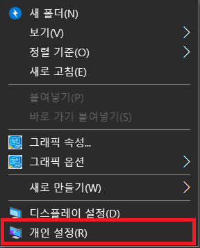 바탕화면에서 아무 빈 곳에 대고 마우스 오른쪽 버튼을 누르면 몇가지 옵션이 나옵니다. 그 중 가장아래 있는 "개인설정"을 눌러서 진입해줍니다.