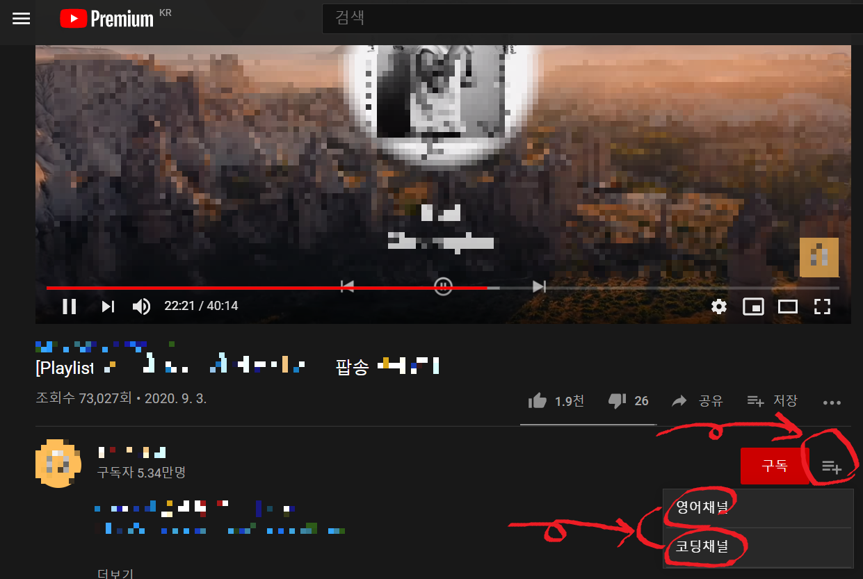 ▼아무 동영상이나 누르고 재생하고 시청하다가 마음에 들어서 구독을 해야겠다면 이제부터는 "구독 옆에 버튼을 눌러주시면 제가 등록한 구독 채널그룹이 두 개가 생성되게 됩니다.