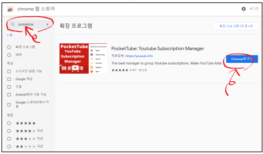 크롬 웹스토어에서 PocketTube를 검색한 뒤 "Chrome에 추가" 버튼을 눌러서 설치를 완료해줍니다.