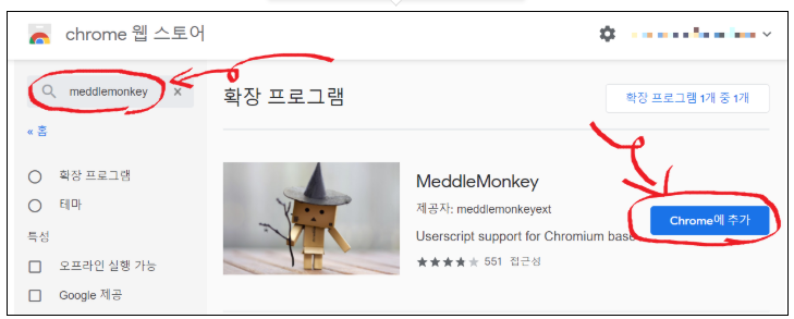 1) 혹은 크롬 브라우저에서 MeddleMonkey를 검색해서 확장 프로그램을 설치해줍니다.