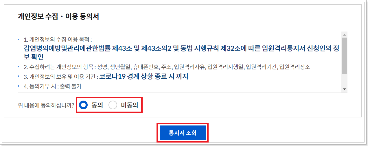 4. 개인정보 수집 및 이용동의서를 확인하고 통지서를 조회합니다.