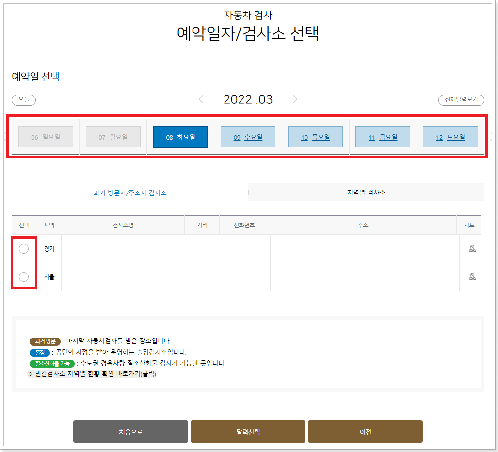 7. 예약일자를 선택하고 검사소를 선택합니다.