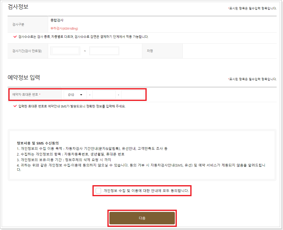 6. 검사정보를 확인하고 예약정보를 입력합니다. 그리고 각종 동의를 확인하고 다음을 클릭합니다.