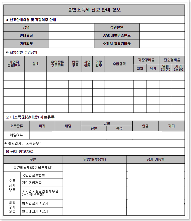 이렇게 신고안내문을 확인하실 수 있으며, 신고를 대행하실 분들은 이 안내문을 세무사에게 전달하여 처리하시면 됩니다. 유형별로 다음과 같이 나눌 수 있습니다.