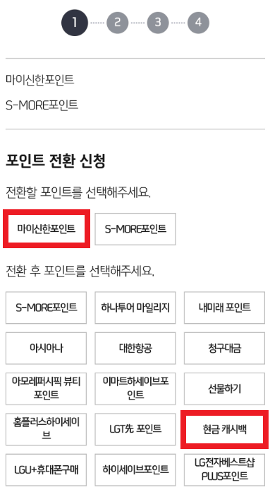 포인트 전환 신청 화면에서 마이신한포인트를 선택한 후, 현금 캐시백을 눌러서 계좌정보와 신청 포인트를 확인한 뒤 전환해주시면 모든 과정이 완료되게 됩니다.