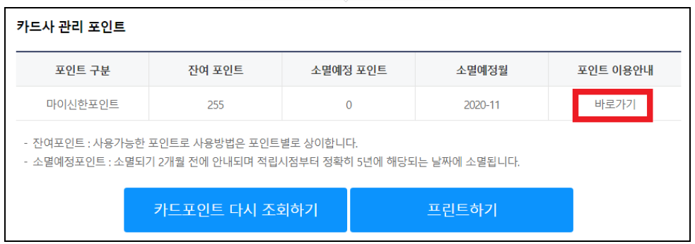 카드사 별로 내가 보유하고 있는 카드 포인트를 조회할 수있습니다. 우선 신한포인트를 예로 설명하겠습니다. 포인트 이용안내에서 '바로가기'버튼을 눌러주세요.