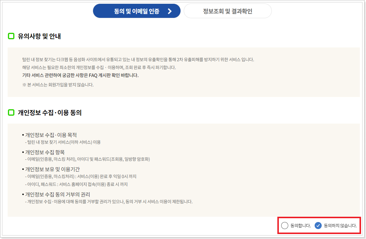 1. 털린 내 정보 찾기 서비스 공식홈페이지에 접속 한 뒤 본인인증을 받을 이메일을 준비합니다.
