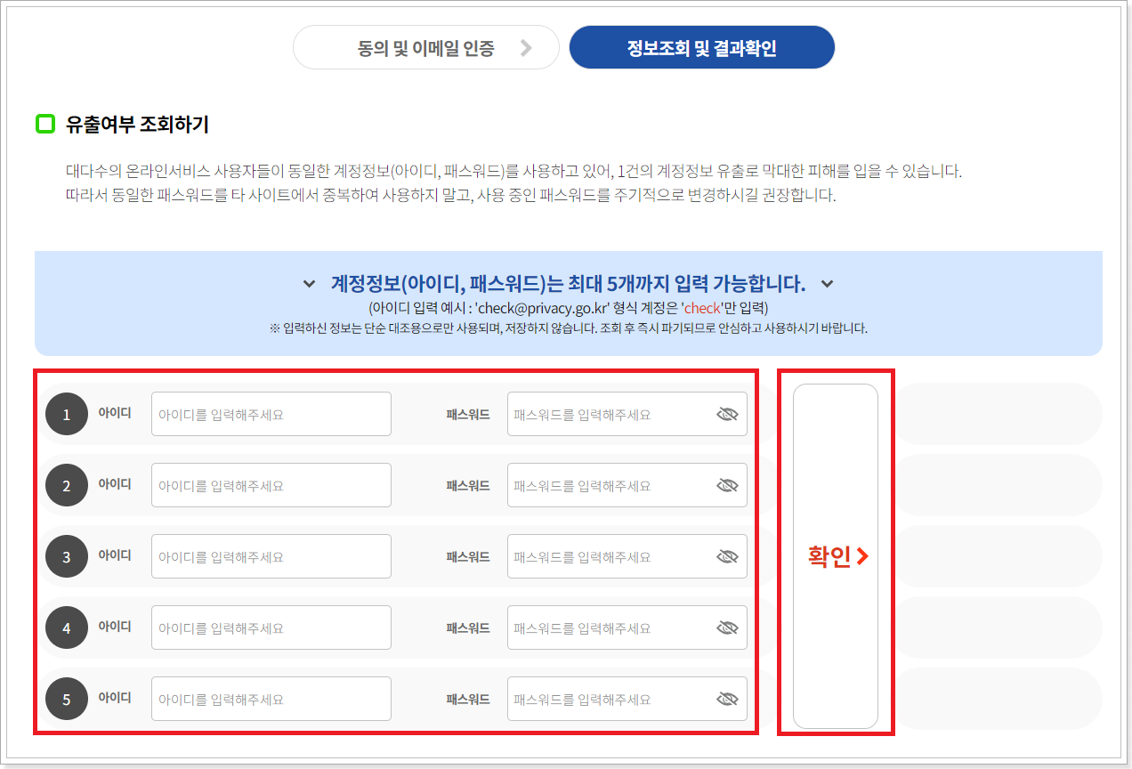o 유출이력이 존재하는 경우에는 즉시 패스워드를 변경하여 2차 유출피해를 방지할 수 있습니다.